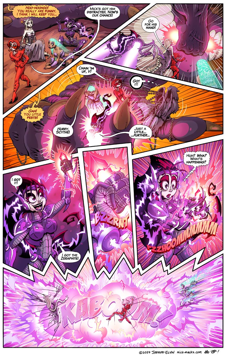 Our heroes manage to wrestle the mysterious Zeraphite from the dragon's grasp, however, an unforeseen reaction with Scythe's cyber-suit causes a massive explosion!